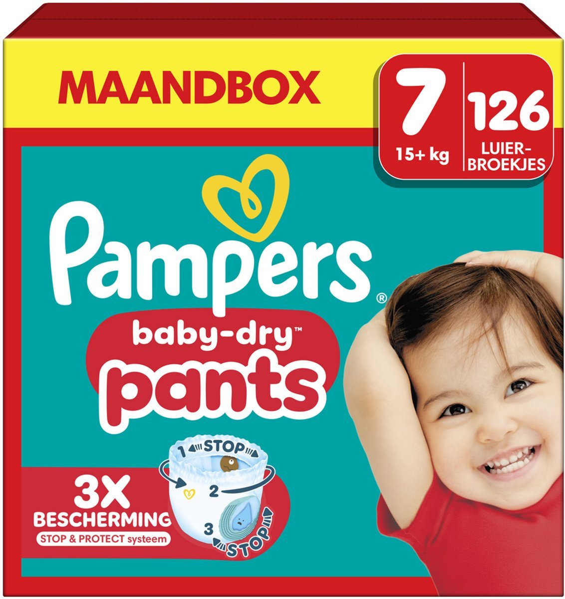 Pampers Baby-Dry Pants Maat 7: 3x bescherming met een Stop & Protect systeem (2x bredere beschermrandjes dan voorheen om lekken aan de zijkanten te helpen voorkomen), een pocket om lekken aan de achterkant te helpen voorkomen en een 360° comfortabele pasvorm