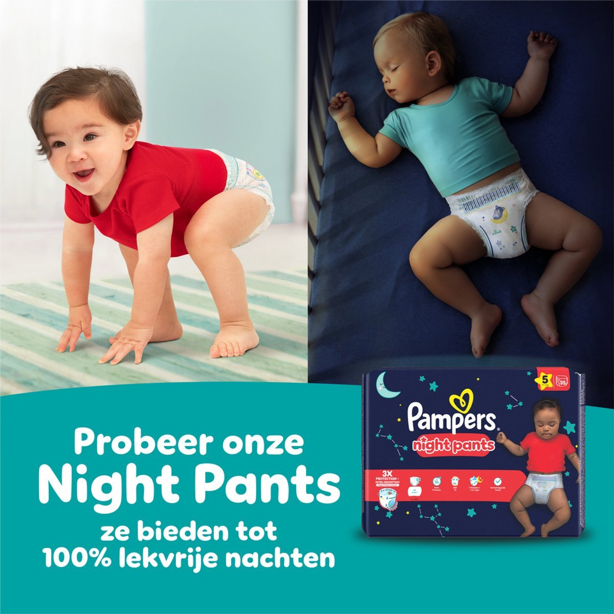 Als je baby actiever wordt, wil je een luierbroekje dat al zijn bewegingen kan bijhouden. Met hun revolutionaire Stop & Protect Systeem bieden Pampers Baby-Dry Pants luierbroekjes superieure bescherming rondom tegen lekken, in welke houding je baby zich ook bevindt – dag en nacht. Pampers Baby-Dry Pants luierbroekjes Stop & Protect Systeem heeft: 2x bredere* beschermrandjes die lekken rond de beentjes helpen voorkomen, een pocket om lekken aan de achterkant te helpen voorkomen, een 360° flexibele tailleband, die zich aan het lichaam van je baby aanpast terwijl hij beweegt en een superabsorberende kern die tot 12 uur bescherming biedt. Net als alle andere Pampers luierbroekjes zijn de Pampers Baby-Dry Pants luierbroekjes heel eenvoudig te verschonen, zelfs als je baby veel beweegt: je trekt ze in één beweging aan, scheurt de zijkanten open om ze uit te trekken, rolt ze op en gebruikt de plakstrip om ze weg te gooien. Net zoals bij jou, komt jouw baby’s veiligheid bij Pampers op de eerste plaats: Pampers Baby-Dry Pants luierbroekjes zijn dermatologisch getest en bevatten 0% EU-parfumallergenen (zoals gereglementeerd in de regelgeving voor cosmetica nr. 1223/2009). Ze zijn goedgekeurd door de dermatologen van de Skin Health Alliance en getest en Standard 100 gecertificeerd door OEKO-TEX. Wil je weten wat de bestanddelen zijn van Pampers producten? Ga naar pampers.nl. *vs. voorheen.